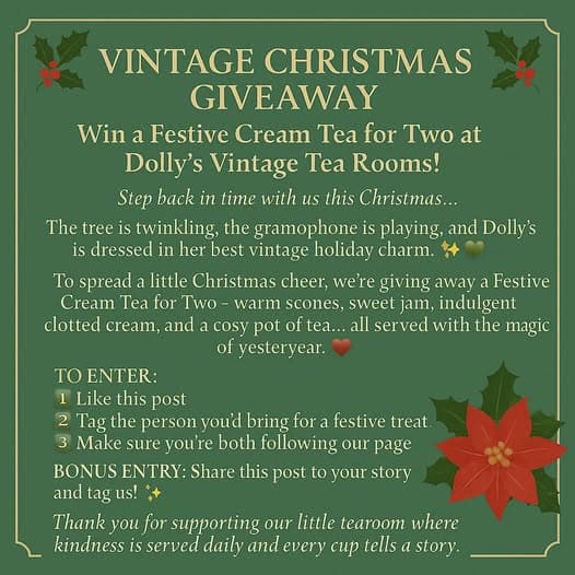 Dolly’s Vintage Tea Rooms is a little sanctuary from the world — a place scented with home-baked goodness, dressed in wartime nostalgia, and filled with gentle music and kind hearts. It’s the sort of place your grandparents would have loved… where stories linger in the air and every table feels like a moment of calm.